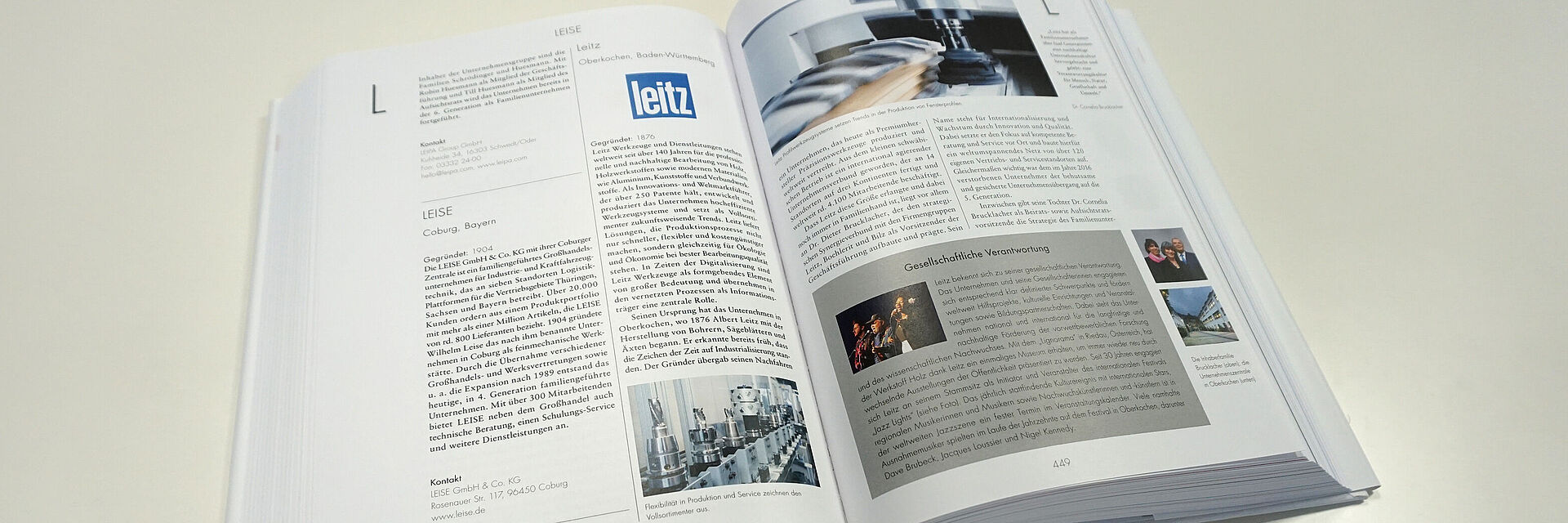 The publication on German family businesses, which is now considered a standard work, is already in its third, newly revised edition. The publisher is Zeit-Verlag with headquarters in Hamburg and Berlin. Data and facts about the companies are presented in alphabetically sorted entries of different lengths. Graphics provide an insight into company parameters and special elements inform about milestones, social commitment or sustainability in corporate management. The encyclopaedia entries are supplemented by picture series and a register ranks the family businesses according to their year of foundation and location.