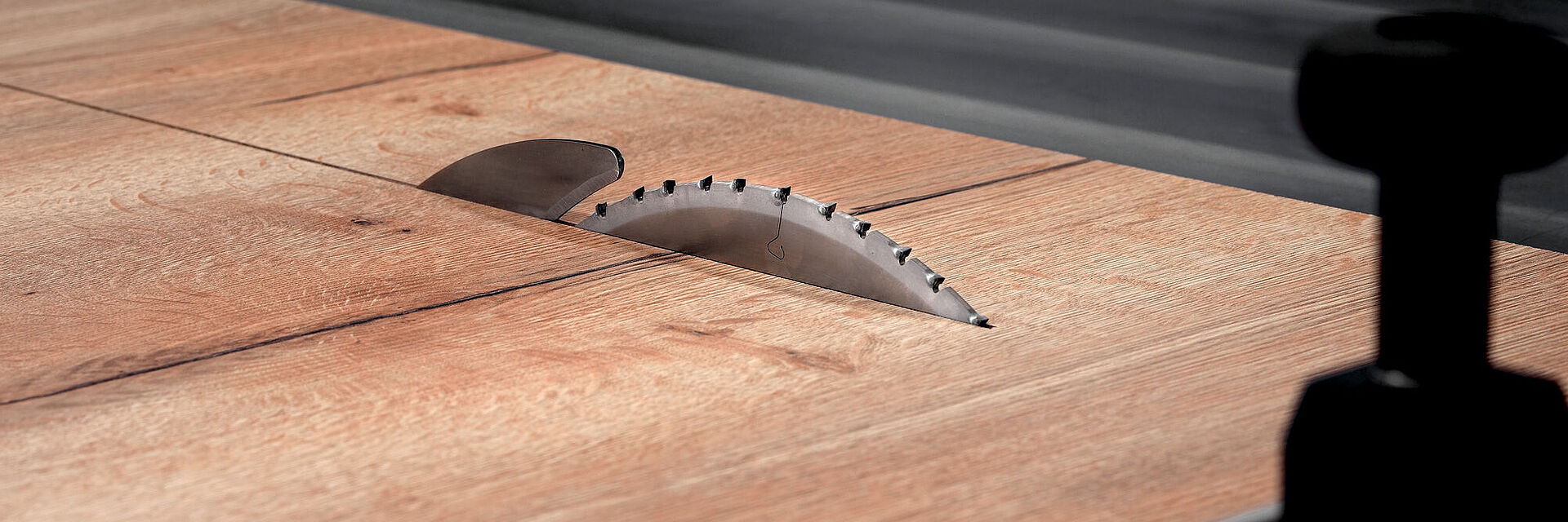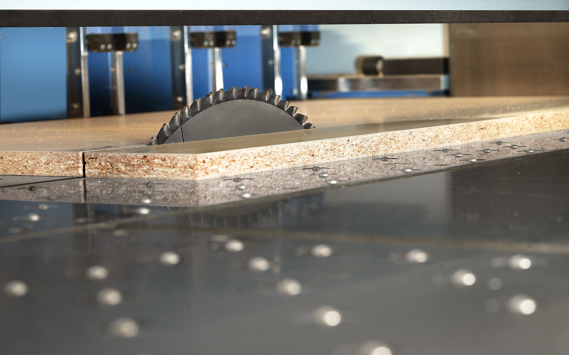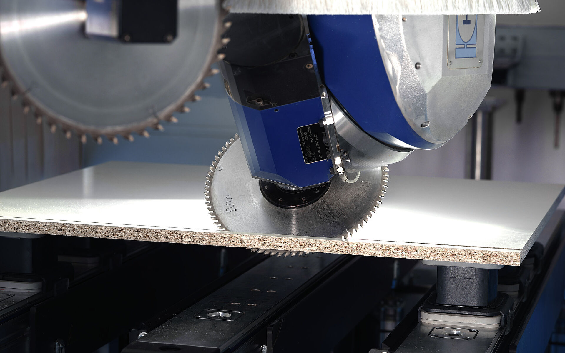 The most traditional processing method is cutting with the help of a sizing saw. Craftsmen attach particular importance to the quality of the cut. As perfect as possible with tear-free edges on both sides and clean cut areas in all panel materials and decors, so that time-consuming reworking can be avoided. To achieve this, it is recommended to use a new or just reconditioned circular sawblade before sawing panel material with sensitive finishes (such as anti-fingerprint materials). To achieve a perfect top edge, the radial projection of the circular saw blade to the panel should be set at up to ten millimeters. To achieve a perfect bottom edge, the use of scoring circular sawblades is highly recommended. In addition, it is advisable to place the panel on the saw table with the visible side facing up. In this way, perfect work results can be achieved and the lifetime of the circular sawblades used can be maximized.