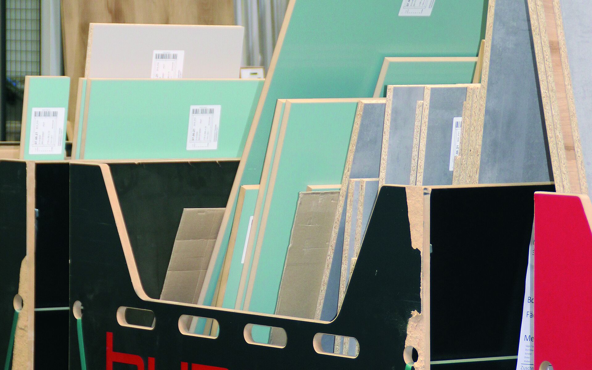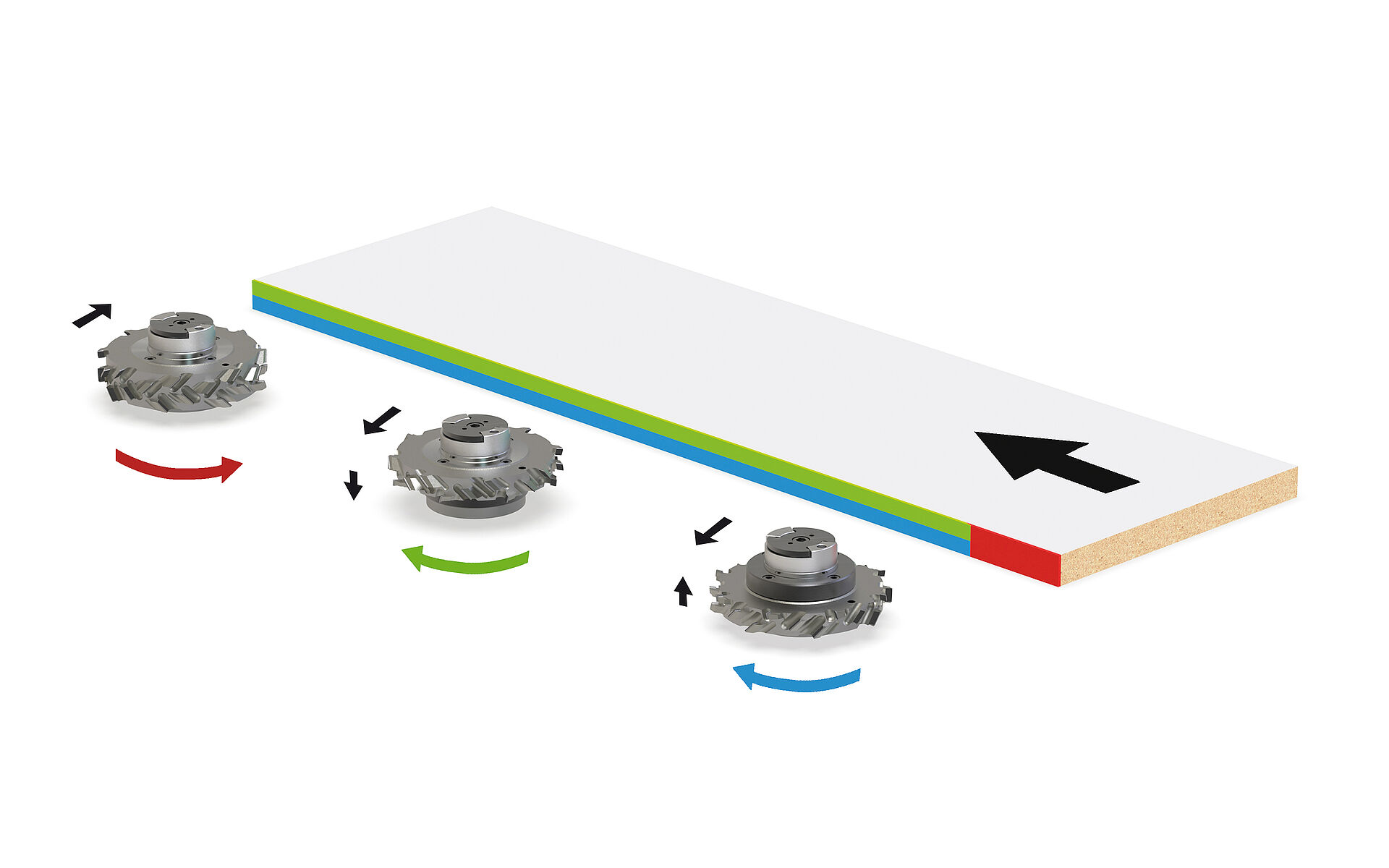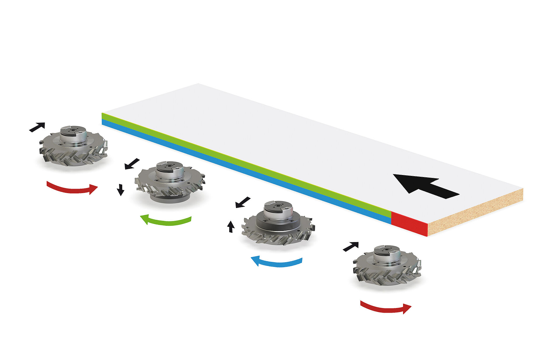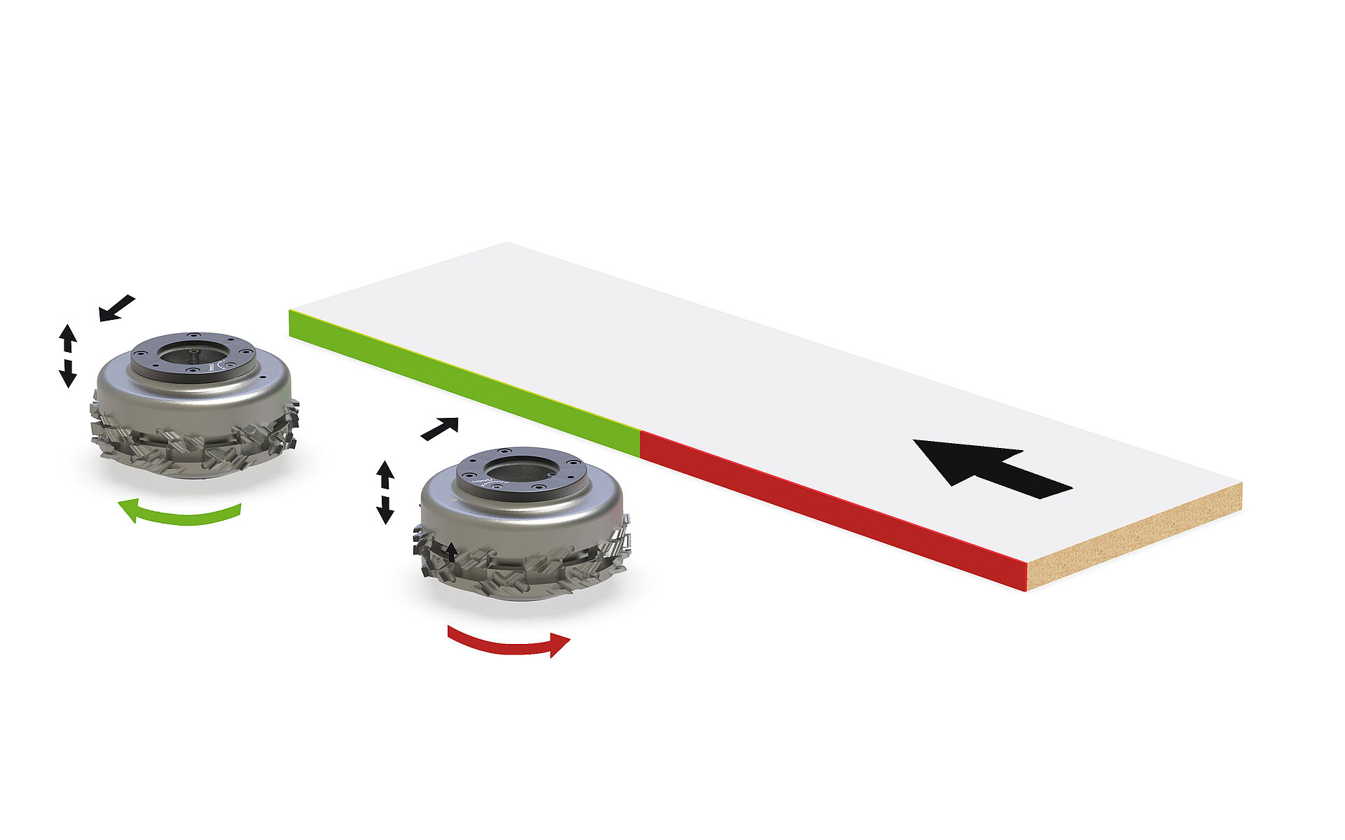 „Dadurch ist die Schnittgüte um ein Vielfaches besser. Wir haben weniger Ausbrüche bei den Oberflächen. Und auch deutlich weniger bei der Mittellage des Spanträgers“, so Vogelpohl. „Zum Vergleich: Ein gegenläufiger Füger rupft immer einen Span aus der Platte heraus. Beim Gleichlauf haben wir den gegenteiligen Effekt und der Span wird eher hineingedrückt. In Zusammenarbeit mit Leitz haben wir uns dazu Gedanken gemacht und ausprobiert, ob es auch wie gewünscht funktioniert. Dafür haben wir eine Versuchsanlage bestückt und getestet. Der Formatschnitt ist schlicht und ergreifend noch einmal sauberer gegenüber den herkömmlichen Werkzeugkonzepten.“