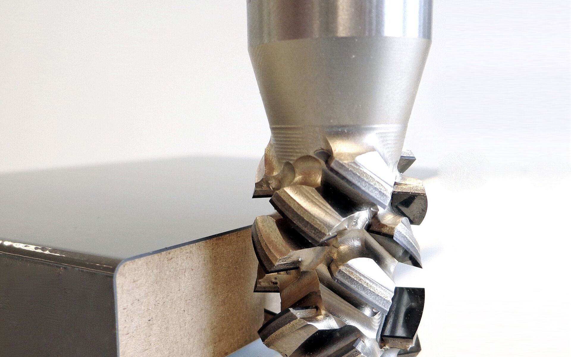 A principal atração é a disposição especial em formato de espiral das arestas de corte. Com ângulos de corte alternados entre 45 e 54 graus, você sempre usina o material no ângulo de pressão perfeito. Os ângulos de corte menores utilizados em ferramentas de corte convencionais permitem camadas intermediárias fresadas de maneira limpa, mas as arestas quebram com muito mais frequência. O oposto é verdadeiro se os ângulos de corte forem definidos muito altos. A qualidade da aresta aumenta aqui, mas as vibrações que ocorrem na peça impedem o corte ideal do substrato. Resultado é um acabamento ruim no miolo.